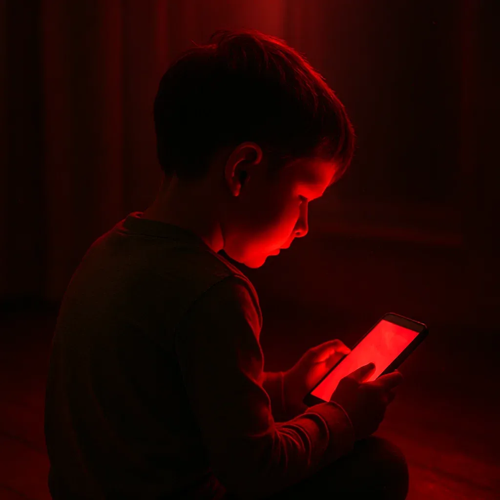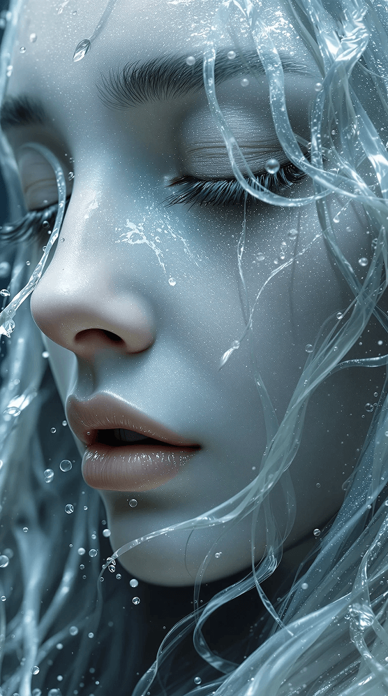 A side-profile close-up portrait with identical features. Cinematic lighting, deep crimson background, luminous skin, and dark clothing.